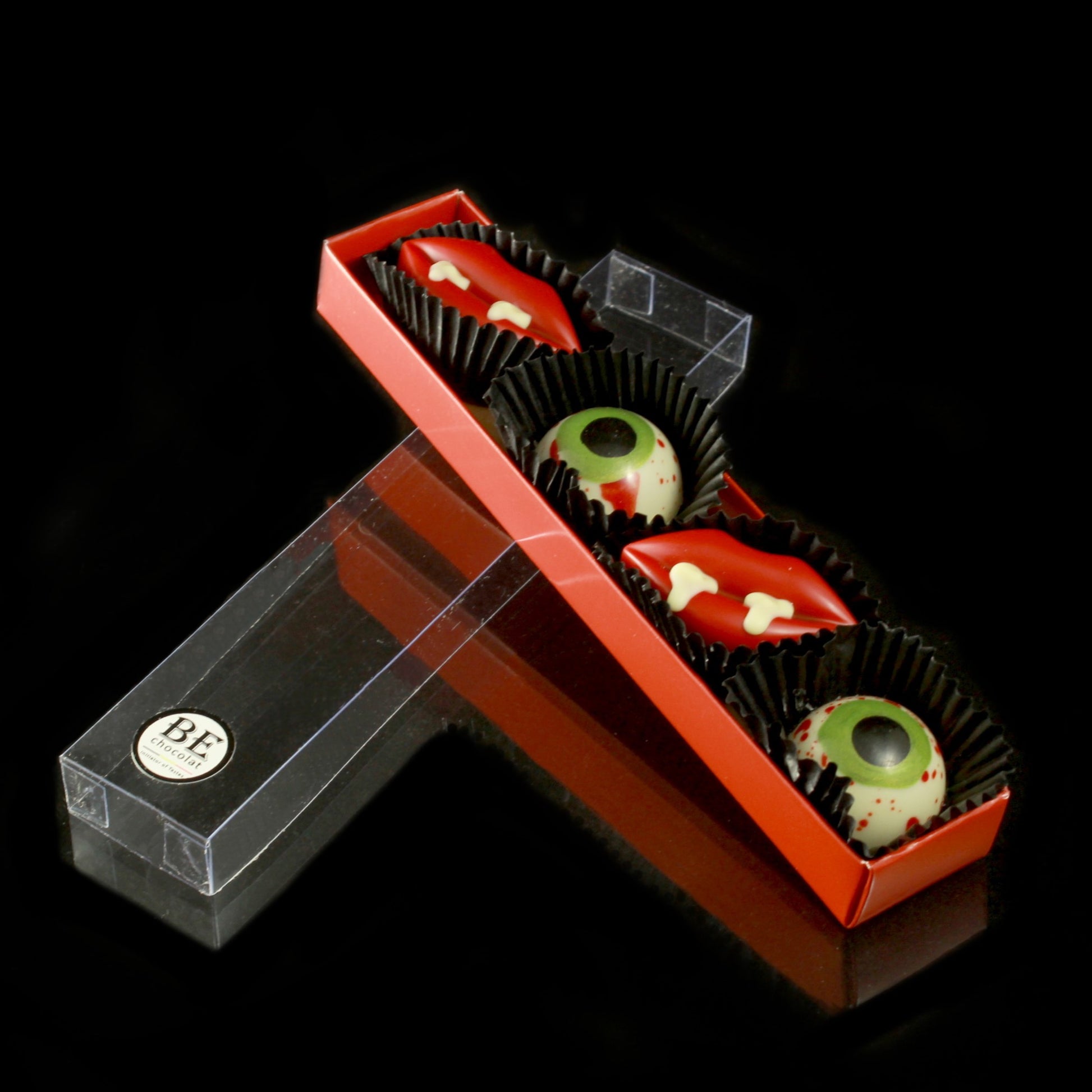 A special edition Halloween Monster box: BE Bloody. Eyes are filled with our famous Salted Caramel. Lips are white chocolate filled with... blood orange ganache!